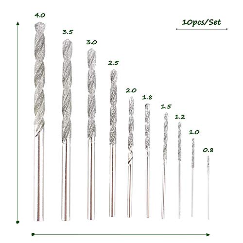 Set di punte da trapano con punta diamantata 10 pezzi, punte elicoidali multimateriale, 0,8/1,0/1,2/1,5/1,8/2,0/2,5/3,0/3,5/4,0 mm, per gemme in pietra per piastrelle di vetro