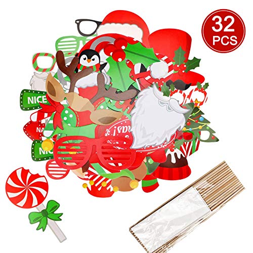 Set da 32 pezzi: contiene 32 diversi oggetti di scena per decorazioni natalizie, inclusi cappelli natalizi, corna, copricapo, occhiali, sciarpe natalizie, labbra rosse, barbe, alberi di Natale, corone, lecca-lecca e altri oggetti di scena a tema. Per le feste e gli incontri di Natale, crea un'atmosfera divertente durante l'evento e incoraggia i tuoi amici e la tua famiglia a scattare foto memorabili.
