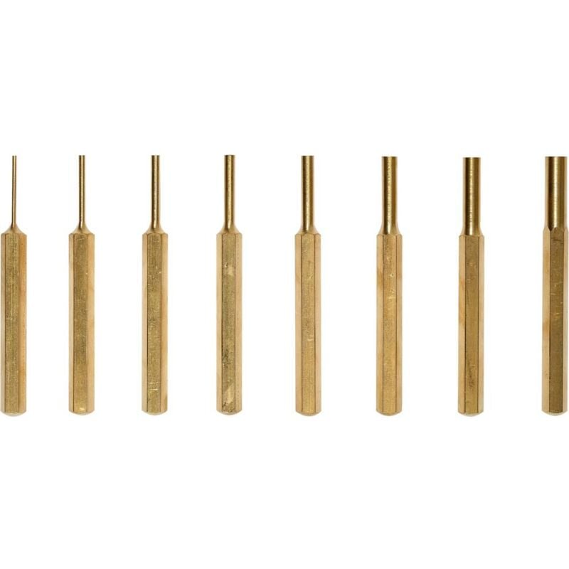 Dati tecnici: Materiale: ottone Lunghezza: 90 mm Diametro gambo: 1.5, 2.3, 3.2, 3.9, 4.7, 5.5, 6.3, 7.8 mm Descrizione: Set di 8 punzoni in ottone, torniti da barra a profilo esagonale. Confezionato in una custodia con chiusura in velcro.