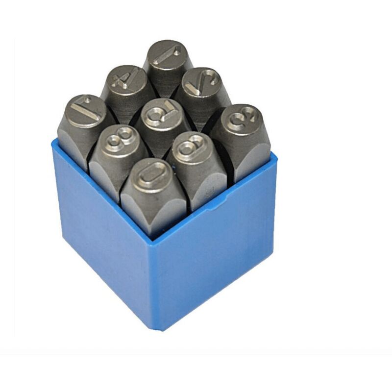 Utilissimo serie di stampini-punzoni di numeri Realizzate in acciaio pieno temprato con finitura sabbiata MISURE: 0 - 8 ø 10 mm Lunghezza: 6,5 cm Totale 9 pezzi Contenuto tutto in una comoda custodia in plastica con tappo