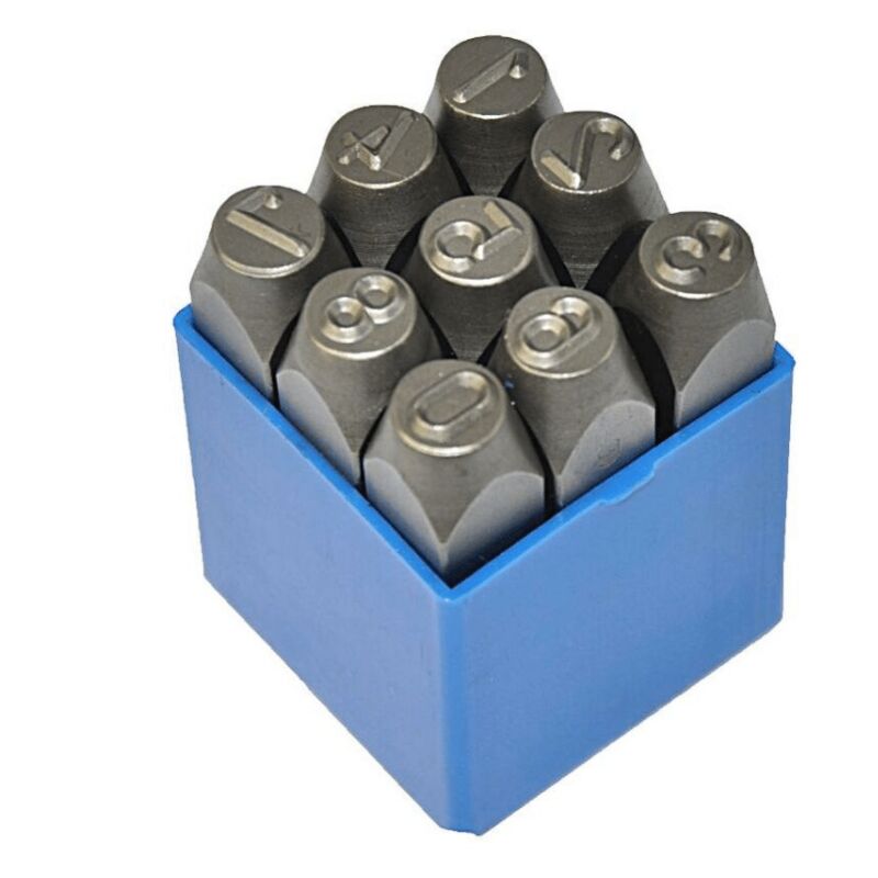 SET PUNZONI STAMPINI NUMERI 9pz DA 6mm TIMBRI PUNZONATORI MARCATURA SU METALLO Utilissimo serie di stampini-punzoni di numeri Realizzate in acciaio pieno temprato con finitura sabbiata MISURE: 0 - 8 ø 6 mm Lunghezza: 6,2 cm Totale 9 pezzi Contenuto tutto in una comoda custodia in plastica con tappo