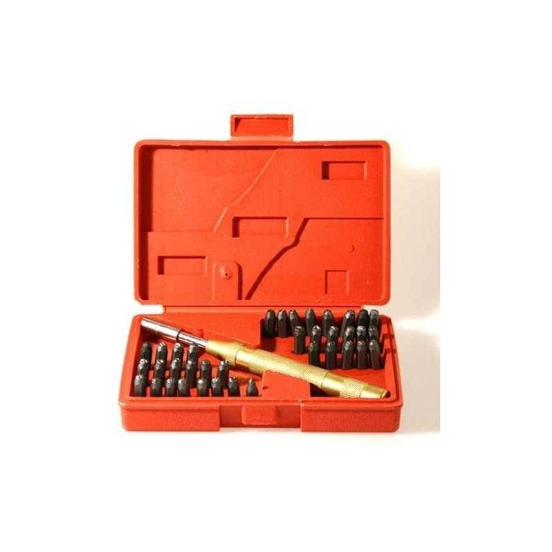 Kit punzoni completo di lettere e numeri, punzone a punta ed il simbolo &. Pronto all'uso grazie all'utensile porta punzoni in ottone resistente adatto per essere battuto con martello. Caratteri in acciaio, incisione molto nitida.