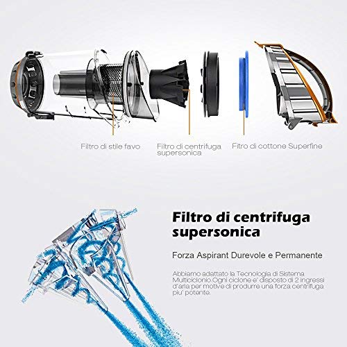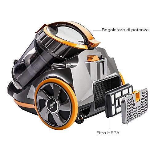 Systema Multi-Ciclonico:Multi-Ciclonico offfre una potenza d'aspirazione forte e durevole,insieme ai 5 livelli di filtraggio separano gradualmente dall'aria la particella piu piccola,i peli di animali e la polvere piu' fine,gli acari,batteri,pollini,,allergeni,muffe,spore e odori. in modo da ottenere un ambiente sano e perfettamente pulito.