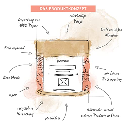 Puremetics Aeratore doccia 3 in 1 "latte di mandorla" (250 g), gel doccia, peeling e lozione in uno, 100% vegano e senza plastica, con peeling di zucchero