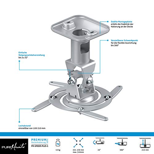PureMounts SPIDER-PLUS Supporto da soffitto per proiettore, inclinabile a 25 °, girevole, distanza dal soffitto: 225 mm, max. 15 kg, distanza tra i fori 180-310 mm, argento
