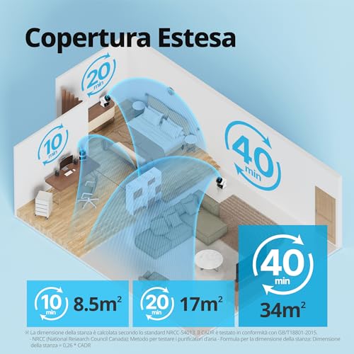 ABBRACCIA LA POTENZA DELLA CIRCOLAZIONE DELL'ARIA: goditi la comodità della funzione di oscillazione automatica del purificatore d'aria HEPA, che copre orizzontalmente un ampio raggio di 80°. Con una leggera brezza che raggiunge ogni angolo della stanza, puoi goderti il perfetto equilibrio dell'aria fresca senza muovere un dito.