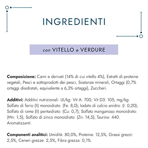 Alimento umido gatti adulti con raffinati filettini di vitello in comode porzioni da 85g per offrirgli ogni volta un pasto fresco