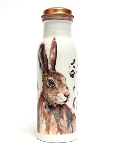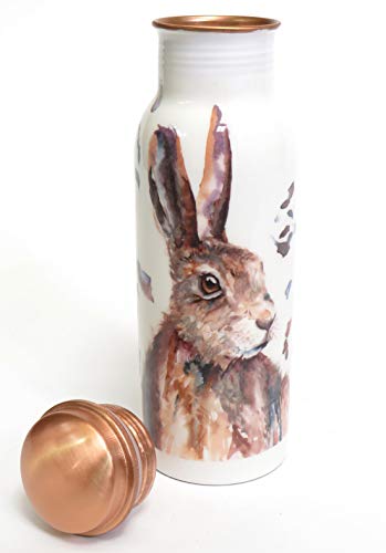 Una bottiglia d'acqua in rame puro realizzato in rame riciclato e caratterizzato da un delizioso design a forma di lepre dipinto a mano da Meg Hawkins. Ideale per l'uso quotidiano a casa o in ufficio, in palestra, yoga, campeggio o passeggiate. Un bel regalo per qualsiasi amante della natura o fan delle lepri, adatto per tutte le età e occasioni, Natale, compleanno, matrimonio, 7° anniversario. Sono forniti in una scatola regalo di carta riciclata.