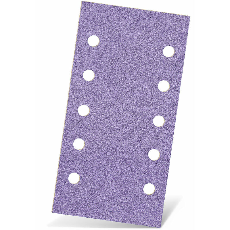 Carte abrasive velcrate MENZER, G150 Informazioni sul Prodotto Autoaffilante Riduzione dell'intasamento grazie al rivestimento antiaderente Risultato di levigatura omogeneo Asportazione di materiale elevata e costante Lunga durata di utilizzo Dati tecnici Supporto: Carta al lattice Dimensioni: 230 x 115 mm Tipo di abrasivo: Fogli abrasivi Attacco: Sistema a strappo Grana classificazione: Fine Foratura: 10 fori Tipo di grana: Miscela di ceramica Applicazione Legno: 8/10 Gesso, stucco: 10/10 Plastica: 10/10 Colore, vernice: 10/10 Legenda: 10 - molto adatto, 0 - non adatto Descrizione del Prodotto MENZER Purple HD - Abrasivo ceramico ad alte prestazioni per le opere di finitura interna Purple HD MENZER è un abrasivo ceramico ad alte prestazioni sviluppato per soddisfare i requisiti più elevati nelle opere di finitura interna. Il mix di granuli ceramici autoaffilanti e corindone semi-friabile garantisce un'eccellente qualità della superficie ed elevate prestazioni di asportazione. Purple