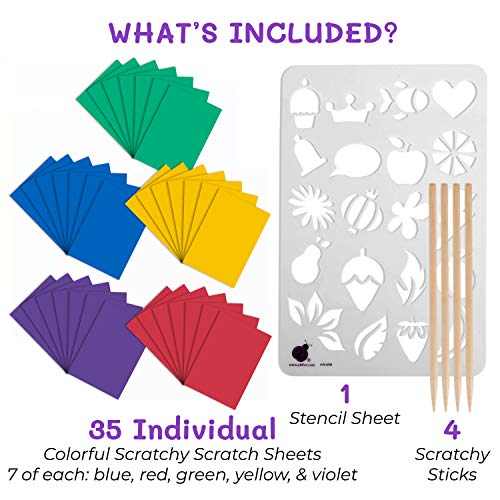 PURPLE LADYBUG Kit Combo Fai da Te Bambini - 35 Fogli Colorati per Scratch Art in 5 Colori - Rosso, Verde, Viola, Giallo e Blu Scratch Paper + Stencils - Idea Regalo per Bambini e Ragazzi