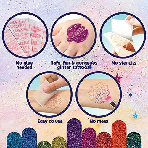 Questi tatuaggi finti glitter sono facili da applicare! Il nostro kit tattoo glitter è super pratico: non serve colla, né acqua, solo glitter per bambini e puro divertimento! Scegli il disegno e i colori che preferisci, puoi anche usarne tanti su un solo tatuaggio!