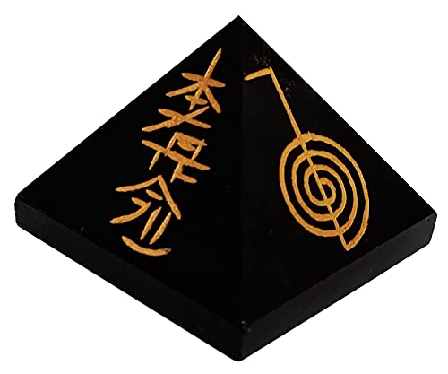 Purpledip Piramide tormalina nera con simboli Reiki: Fascino di guarigione della buona fortuna, pietra di cristallo spirituale divina (12333)