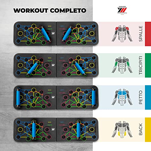 [MULTIFUNZIONALE]: YM Push Up Board è la tavola da allenamento per flessioni con guide colorate e accessori di posizionamento. La superficie presenta fori per il posizionamento lungo 4 diversi percorsi colorati: è sufficiente inserire le maniglie nelle posizioni segnate dai fori e dai colori per assumere posizioni diverse e sempre perfette. Ogni colore permette di allenare un gruppo muscolare diverso!