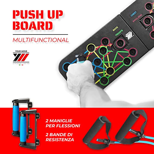 [ALLENAMENTO GUIDATO]: YM Push Up Board include: 1 x Tavola per Flessioni - 2 x Maniglie per Flessioni - 2 x Bande di Resistenza. Le maniglie e le bande elastiche si applicano alla tavola per strutturare allenamenti mirati. Le bande elastiche si agganciano ai pratici anelli pieghevoli al centro e ai lati della tavola. Le molteplici posizioni guidate permettono di compiere con un unico strumento intere sessioni di allenamento completo, come con un personal trainer.