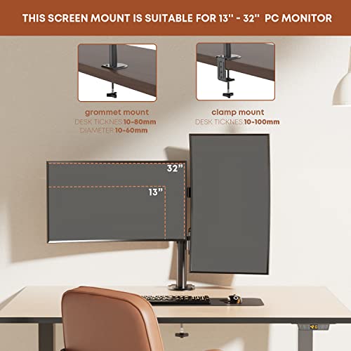 PUTORSEN Supporto Doppio Monitor per Schermo 13 a 32 Pollici, Ergonomica Inclinazione e Rotazione Braccio Monitor Scrivania con Morsetto, Dimensioni VESA 75/100 mm, Peso Max 8KG