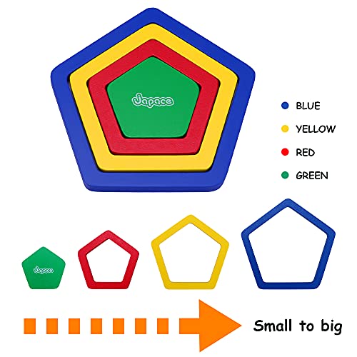 【Riconoscimento di Forma&Colore e Taglia】 Il puzzle educativo 4 in 1 può aiutare i bambini in età prescolare a riconoscere forme, dimensioni e colori. Il nostro puzzle in legno arcobaleno include 4 forme geometriche di dimensioni sfumate (cerchio, triangolo, quadrato, pentagono) e 4 colori (rosso, giallo, verde, blu). I bambini impareranno i colori e le forme di base mentre giocano con i mattoni.