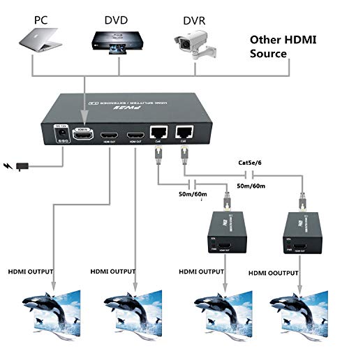 PWAY PW-HTS0102IR(POC) 1X2 Splitter HDMI Extender Over Cat6 Ethernet Cavo con Senza Ritardo Telecomando a 60m/196ft 1080P IR Controllo(20-60Hz) (1 in 2 out)
