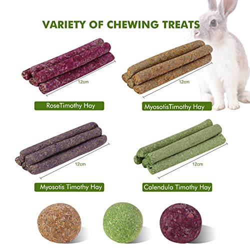 26 Giocattoli da Masticare Ben Assortiti - offrono molto divertimento ai tuoi adorabili animali domestici. La lista di imballaggio contiene 5 bastoncini di fieno Timothy, 5 bastoncini di fieno al gusto di rosa, 5 bastoncini di fieno non ti scordar di assaporare, 5 bastoncini di fieno al gusto di calendula, 2 palline di fiori di rosa, 2 palline di erba di calendula, 2 palline di fieno di Timothy. Un totale di 26 giocattoli da masticare. Il tuo coniglio si divertirà moltissimo a masticarli