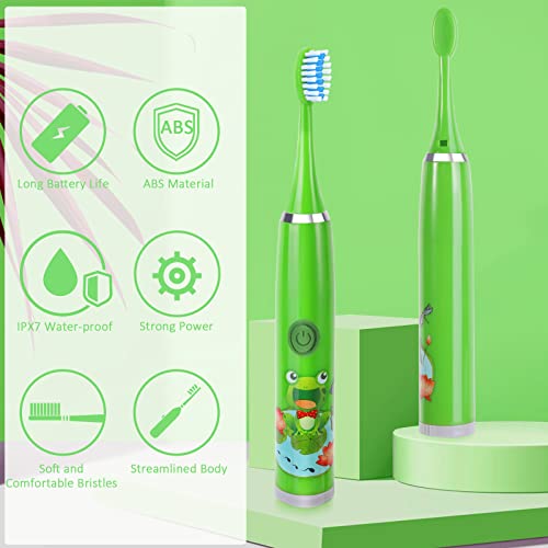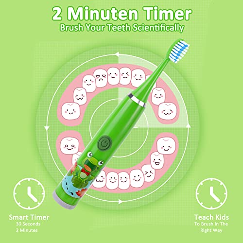 Pwsap Spazzolino Elettrico Bambini 3-12 Anni, Spazzolino Dentale Igiene Orale Batteria Silenziosa Impermeabile Spazzolino Elettrico per Bambini con 5 Testine, Ragazzi e Ragazze, Verde