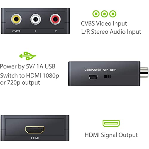 【Convertidor RCA a HDMI】Convierte entrada analógica RCA compuesta (amarillo, blanco, rojo) a salida HDMI 720P/1080P (60Hz), que se muestra en HDTV/monitor.