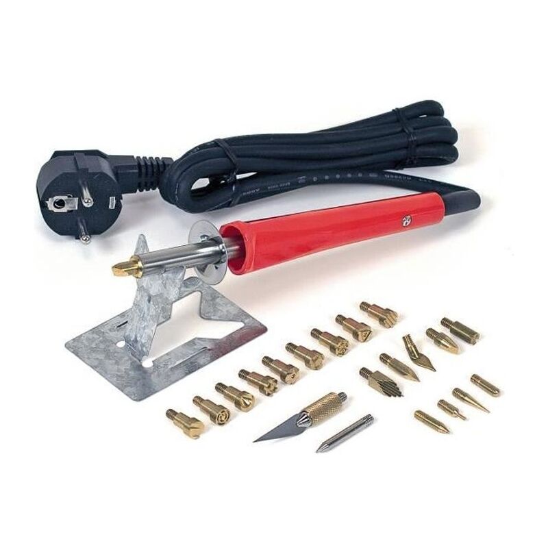 Kit completo, ideale per il lavoro su legno e il vostro hobby. Scrivere, disegnare, decorare realizzare linee sottili e ornamenti su legno, cuoio, sughero, ... Molti accessori (punte, tamponi e asse da modelli) per creare vari modelli. custodia in plastica per la conservazione del desktop