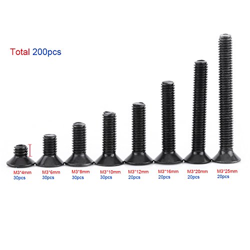 200 Pz/Scatola M3 M3 Vite Per Macchina, Vite a Testa Piatta Svasata Vite a Esagono Incassato Bullone Assortimento di Fissaggio Per Macchina, Viti Assortimento Strumento di Riparazione Accessorio,Nero