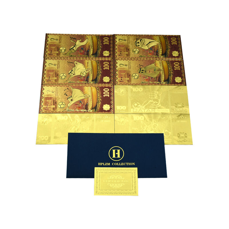 8 pz/set 2022 Qatar Football Commemorative Card banconote Lucky Mascot Gold Foil banconote souvenir per la decorazione domestica Materiale: PET con lamina d'oroDimensioni: 5.9*2.5 polliciStile: qatarUtilizzo: regali d'arte da collezione per la casa