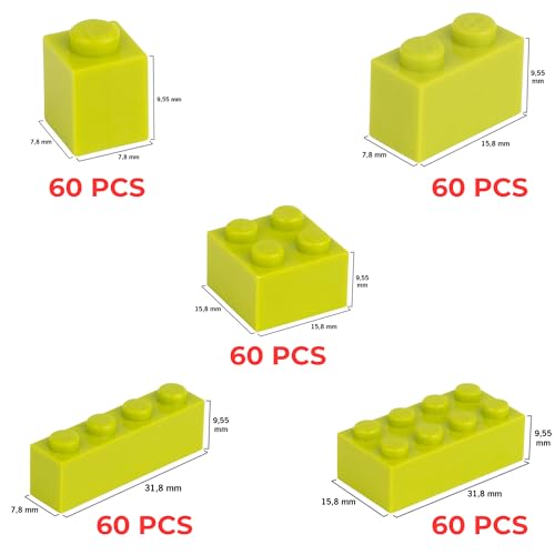Il set contiene 300 mattoncini di dimensioni 1×1 (60 pezzi), 1×2 (60 pezzi), 1×4 (60 pezzi), 2×2 (60 pezzi) e 2×4 (60 pezzi).