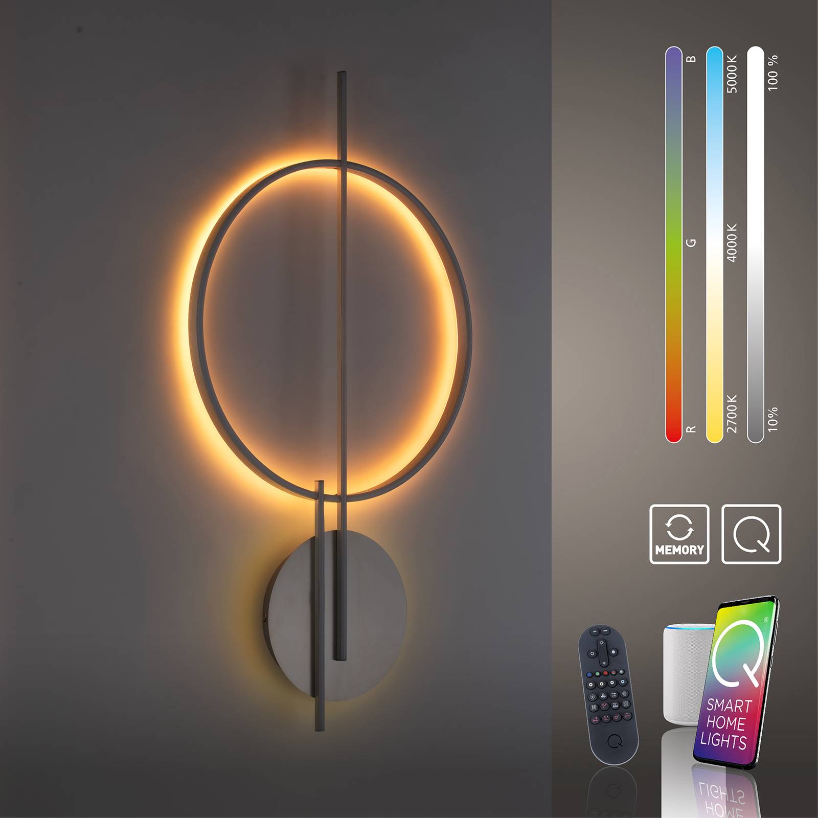 Lampada da parete decorativa a LED Q-ARKOA con telecomando, compatibile con ZigBeeCon il suo straordinario design, la lampada da parete a LED Q-ARKOA è un grande richiamo per la zona giorno anche quando è spenta. Può essere utilizzata come luce a parete o a soffitto, a seconda delle esigenze, e offre effetti di luce di grande effetto. L'apparecchio rotondo è dotato di una luce frontale con funzione CCT che consente di variare il colore della luce da bianco caldo a bianco universale. La retroilluminazione proietta la luce verso la parete o il soffitto e dispone di una funzione RGB. Q-ARKOA può essere controllato con il telecomando in dotazione. In questo modo è anche possibile dimmerare l'apparecchio, accedere a diversi scenari luminosi e attivare la funzione di memoria. Grazie alla sua capacità ZigBee, l'apparecchio può essere integrato in un sistema Smart Home corrispondente e può quindi essere controllato anche tramite app o comando vocale.Dati tecnici/compatibilità:- dimmerabile- temperatura della luce regolabile da bianco caldo a bianco universale Funzione RGB- funzione di memoria- commutazione di un massimo di 20 singoli apparecchi Q o Q-lampade a max. 3 gruppi con un solo telecomando Q- compatibile con ZigBee- controllabile con il telecomando- controllo vocale tramite Echo (4a gen.), Echo Studio e Echo Show 10 (3a gen.) direttamente possibile- se integrato in un sistema smart home basato su ZigBee, controllabile comodamente anche tramite app o comando vocaleNota: per l'integrazione in un sistema smart home o per il controllo tramite app, è necessario un ponte;
