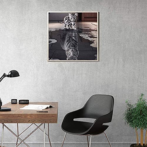 【Design Unico】 Il contenuto dell'immagine del ricamo di strass di gatto e tigre è: il gattino è stato in piedi vicino all'acqua stagnante, ma l'acqua non è il suo riflesso, ma una tigre. Questo dipinto esprime un atteggiamento ambizioso e riluttante nei confronti della vita.