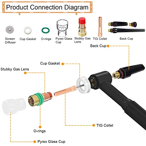 ▲ Il pacchetto include: 4 * #12 Glass Cup, 4 * 17GL332 Collet Corpo Stubby Gas Lens 2.4mm 3/32", 4 * 10N24S Collets per torcia per saldatura Tig 2.4mm 3/32", 3 * Back Cup, 2 * Cup Guarnizione, 2 * Diffusore schermo, 10 * O-ring.