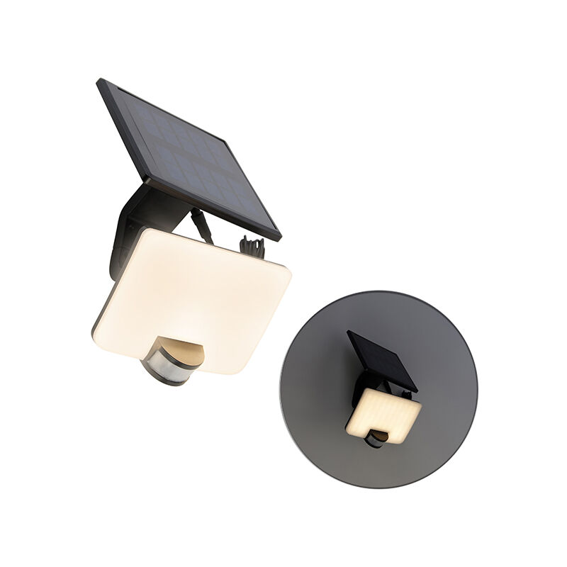 QAZQA Radiatore moderno nero con LED IP54 Solar - Elif Cerchi una lampada da esterno sostenibile? Allora Soko fa per te! Questa lampada da parete utilizza un pannello solare, con il quale viene caricata dal sole. Il rilevatore di movimento assicura che l'illuminazione si accenda solo quando ci passi accanto, in modo da non sprecare luce ed elettricità inutilmente. La lampada è realizzata in plastica e rifinita in nero. Ha una profondità di 12 cm, un'altezza di 29 cm e una lunghezza di 18 cm. La piastra di montaggio ha una profondità di 2 cm, una lunghezza di cm e una larghezza di 6 cm. La lampada è dotata di illuminazione a LED integrata. Ha una potenza luminosa di 800 lumen e 3.000 Kelvin. Questo dà molta luce bianca. In media, dura circa 25.000 ore di combustione. Grazie al suo valore IP di IP54, la lampada da parete è resistente agli spruzzi d'acqua, perfetta ad esempio per essere posizionata accanto alla porta d'ingresso. Diventa sostenibile con la lampada da parete Elif.