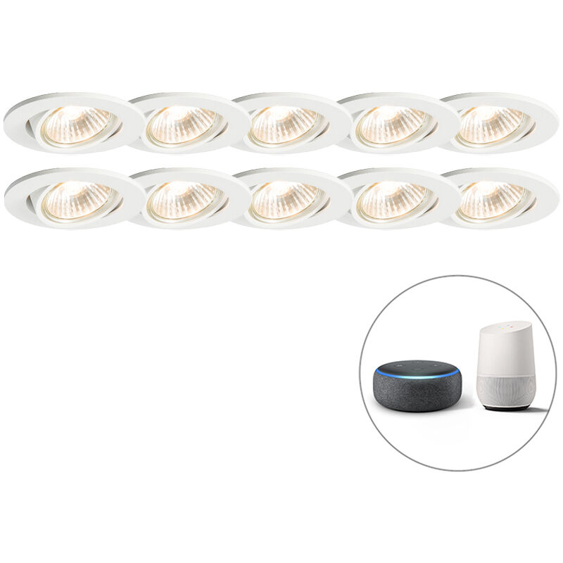 QAZQA Set di 10 faretti da incasso intelligenti bianchi inclinabili incluso Wifi GU10 - Cisco Video Questi punti Cisco non dovrebbero mancare in un interno moderno. Il loro colore bianco li rende molto intramontabili e si fondono magnificamente con un soffitto bianco. I punti sono realizzati in alluminio. Ogni spot ha un diametro di 8,9 cm e un'altezza di 8 cm. Le dimensioni di installazione dei faretti sono una profondità di 10 cm e un diametro di 7,5 cm. Gli spot sono forniti con 10 sorgenti luminose intelligenti. Questi sono facili da controllare con l'app sul tuo smartphone, tablet o assistente domestico. Gli spot sono anche dimmerabili nell'app. Illumina il tuo soggiorno, cucina o camera da letto con i faretti da incasso Cisco! Portalampada: GU10 . Max 10 x 4.8 W, 230 V Adatto a: LED Voltaggio: 220V/230V IP Classe di protezione: [IP20] A prova di polvere Funzioni extra: Regolabile: Dimmer escluso Lampadine inclusiva Il QAZQA Set di 10 faretti da incasso intelligenti bianchi