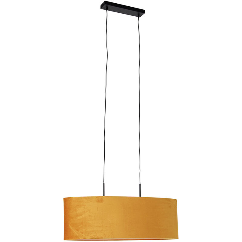 QAZQA Lampada a sospensione moderna nera con paralume giallo 2 luci - Tanbor Cerchi un'aggiunta moderna alla tua casa? Dai un'occhiata alla nostra serie di lampade a sospensione Tanbor! Questo accattivante è rifinito con un dispositivo nero e un sorprendente paralume giallo. La forma ovale della cappa dona una sensazione di design ai tuoi interni. La lampada sta benissimo sopra il tavolo da pranzo, sopra l'isola della cucina o nel tuo ufficio a casa. Ha un'altezza di 160 cm. Il paralume ha una larghezza di 22 cm e una lunghezza di 75 cm. La lunghezza del cavo della lampada è di 131,5 cm. Tanbor è rifinito con due punti luce. Nota: le sorgenti luminose non sono incluse, quindi prenditi cura di 2 sorgenti luminose E27 di massimo 15 Watt! Dai un tocco di design a casa tua con questo accattivante! Portalampada: E27 . Max 2 x 15 W, 230 V Adatto a: Incandescente, Algogene, LED,Risparmio energetico Voltaggio: 220V/230V IP Classe di protezione: [IP20] A prova di polvere Funzioni extra