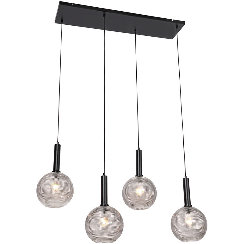 QAZQA Lampada a sospensione di design nera con vetro fumé a 4 luci - Chico Dai un tocco di stile ai tuoi interni di design con la lampada a sospensione Chico! Questa lampada a sospensione nera, realizzata in vetro e acciaio, cattura subito lo sguardo grazie ai 4 punti luce. Chico ha una lunghezza di 110 cm, una larghezza di 25 cm e un'altezza di 170 cm. È perfetto sopra un tavolo da pranzo, in soggiorno o in altri spazi centrali. Non dimenticare di acquistare separatamente le sorgenti luminose con attacco E27 (max. 40W) poiché non sono incluse. Chico è dimmerabile, ma la lampada non ha un dimmer. Lasciati incantare da questa sorprendente lampada a sospensione: Chico è un complemento indispensabile per i tuoi interni! Portalampada: E27 . Max 4 x 40 W, 230 V Adatto a: LED Voltaggio: 220V/230V IP Classe di protezione: [IP20] A prova di polvere Funzioni extra: Regolabile: Dimmer escluso,No, senza cavo e spina Lampadine exclusiva Il QAZQA Lampada a sospensione di design nera con vetro fumé