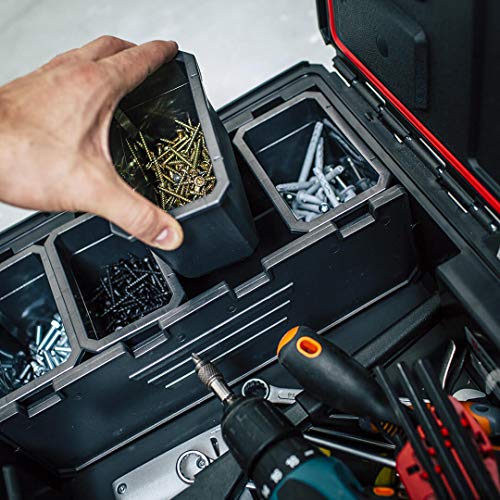 Scatola modulare per attrezzi che combina le caratteristiche di un contenitore per strumenti di medie dimensioni con le funzioni di un organizer