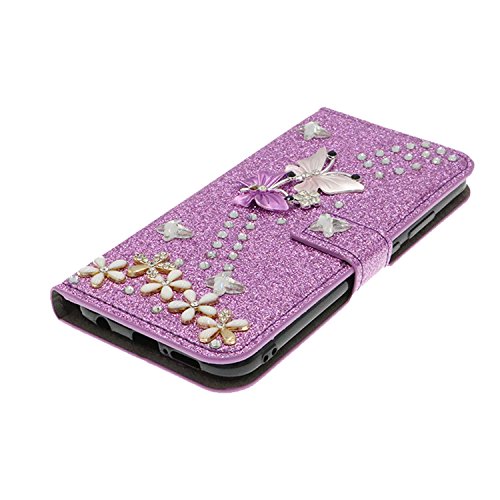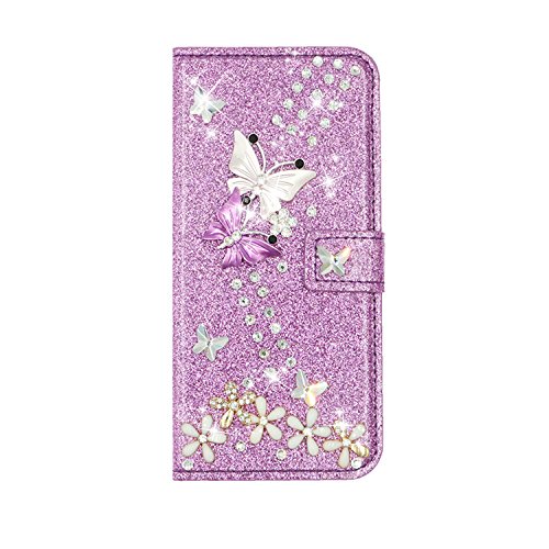 QC-EMART Cover per Samsung Galaxy A10 Custodia in Pelle Viola Glitter Paillette Luccichio Farfalla Portafoglio Porta Carta Guscio Caso Case Protettiva Custodie Cellulari per Ragazza