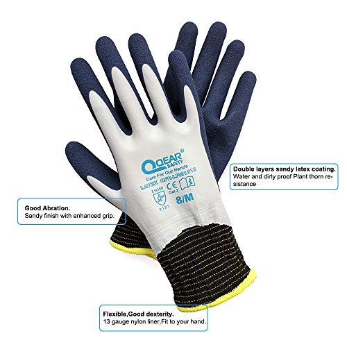 Qear Guanto da giardino in lattice completamente rivestito, impermeabile e resistente alle spine di rosa, Large/9", Blu/crema