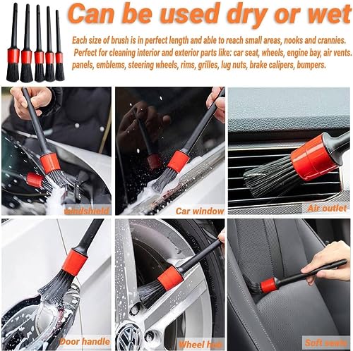 5 spazzole di diverse dimensioni di dettaglio: 5 diverse dimensioni di spazzole per dettaglio, che sono abbastanza lunghe da estendersi facilmente nel dado dell'aletta, stretto e in qualsiasi altra area difficile da raggiungere. Ideale per la pulizia interna ed esterna.