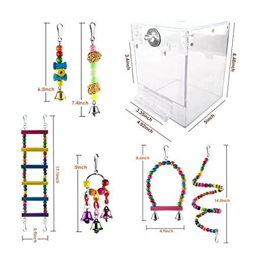 QeeHeng Vasca da Bagno per Uccelli, Contenitore per Uccelli da 13 x 13 x 17 cm, Contenitore Trasparente per mangiatoia per Uccelli Piccoli, (Senza perdite e 6 Giocattoli per Uccelli) (Trasparente)