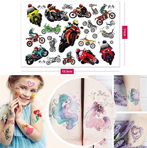Qemsele Tatuaggi temporanei per Bambini, 8 Sheet 160+ Pcs Unicorno Tatuaggi Finti temporanei Adesivi per bambini Ragazzi festa di compleanno sacchetti regalo Giocattolo (Motorcycle)