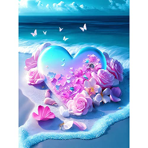 QENSPE 5D Diamond Painting Spiaggia Kit per Diamond Painting Adulti, DIY Pittura Diamante Fai da Te Painting Kit Completo per Bambini Decorazione per Casa e Pareti 30x40cm (Cuore Fiori)