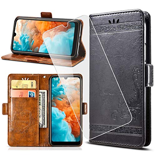 QFSM Nero Skin Custodia + Vetro Temperato per Ulefone Note 9P, Protettiva in Pelle PU Retro Embossed Custodia Bookstyle Flip Cover Portafoglio (Wallet Purse) with Vetro Pellicola Glass