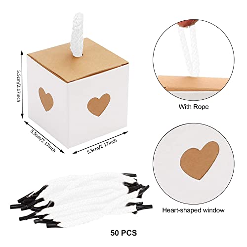 CONFEZIONE DA 50 SCATOLE FAVORE: Il nostro set contiene 50 scatole regalo per bomboniere. Sono inclusi 50 inserti marroni e 50 maniche esterne bianche con 50 manici in spago spesso. Ogni scatola misura 5,5 x 5,5 x 5,5 cm (2,17 x 2,17 x 2,17 pollici).