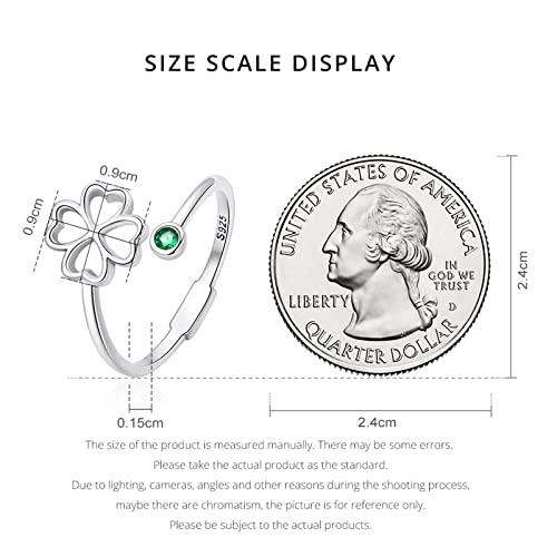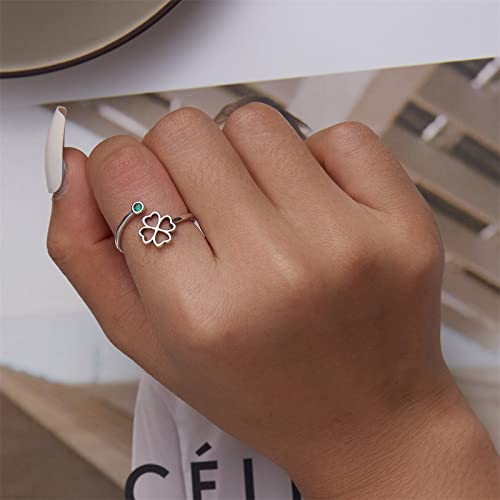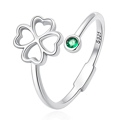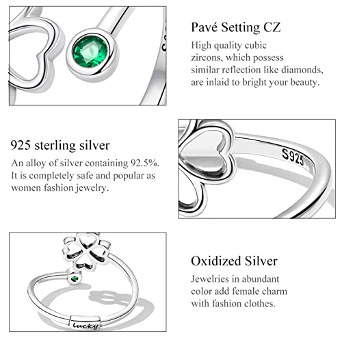 Qings Anello Aperto Quadrifoglio 925 sterline d'argento Foglie cave Gemma verde scintillante Regalo di gioielli per il giorno di San Patrizio fortunato per te