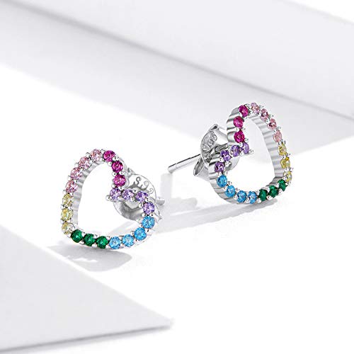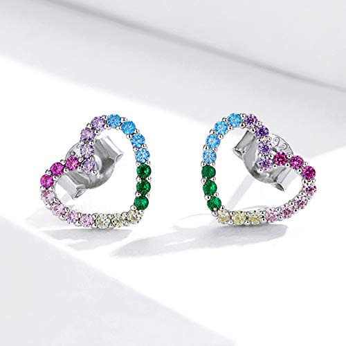 Qings Orecchini a forma di cuore arcobaleno in argento Sterling 925 con zirconia cubica colorata ipoallergenica per orecchie sensibili, regalo di compleanno per donne e ragazze,
