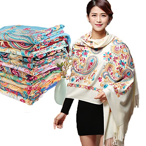 Qingzhuan Donna Sciarpa Scialle Pashmina Invernale Elegante Lungo Morbida pashmina Ricamo retrò a maglia quattro stagioni universale quadrato grande Calda Stole Avvolgere Bianco