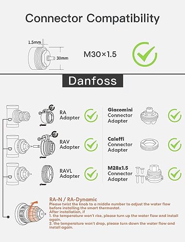☆.【Altre funzioni】:La valvola termostatica è inoltre dotata di protezione antigelo, regolazione della luminosità, modalità di risparmio energetico e può controllare le variazioni di temperatura e altre funzioni. Il termostato funziona a batteria e l'alimentazione verrà visualizzata sullo schermo in modo da poter rilevare il consumo energetico e sostituire la batteria in tempo.