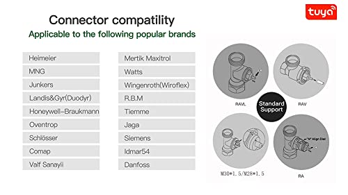Forte compatibilità dimensionale: la direzione del display del carattere è regolabile. Il dado ad anello attaccato al termostato del radiatore può essere utilizzato universalmente e senza accessori per tutte le valvole con una filettatura di M30 x 1,5 dei produttori più popolari, adattatori per Danfoss (RA, RAV e RAVL) 28 x 1,5 mm, Caleffi, Giacomini, asta di espulsione.