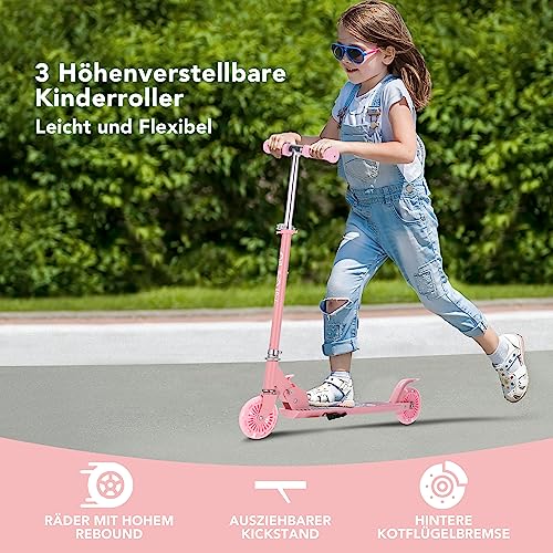 QIUYO Monopattino per bambini dai 4 ai 7 anni, pieghevole con 3 ruote regolabili in altezza in PU LED con cavalletto, scooter a 2 ruote per bambini dai 3 anni in su, regali per ragazzi e ragazze